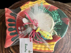 This whimsical red/green/yellow fish platter includes one 7oz jar of Kudzu Kottage Ambrosia jam - a blend of coconut, pineapple and banana like the fruit salad, and a funky fish soreader.