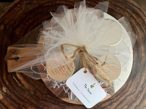 This round green marble cheese board features a metal display of bird houses, a matching marble spreader, three 2 oz jars of Hummingbird, Hibiscus and Rhubarb Cherry Rose jams and 8 cocktail forks with birdhouse motifs.