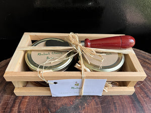 For the rhubarb connoisseur this large gift crate features two 7 oz jars of Kudzu Kottage Really Rhubarb and Rhubarb Cherry Rose jams and a spreader.