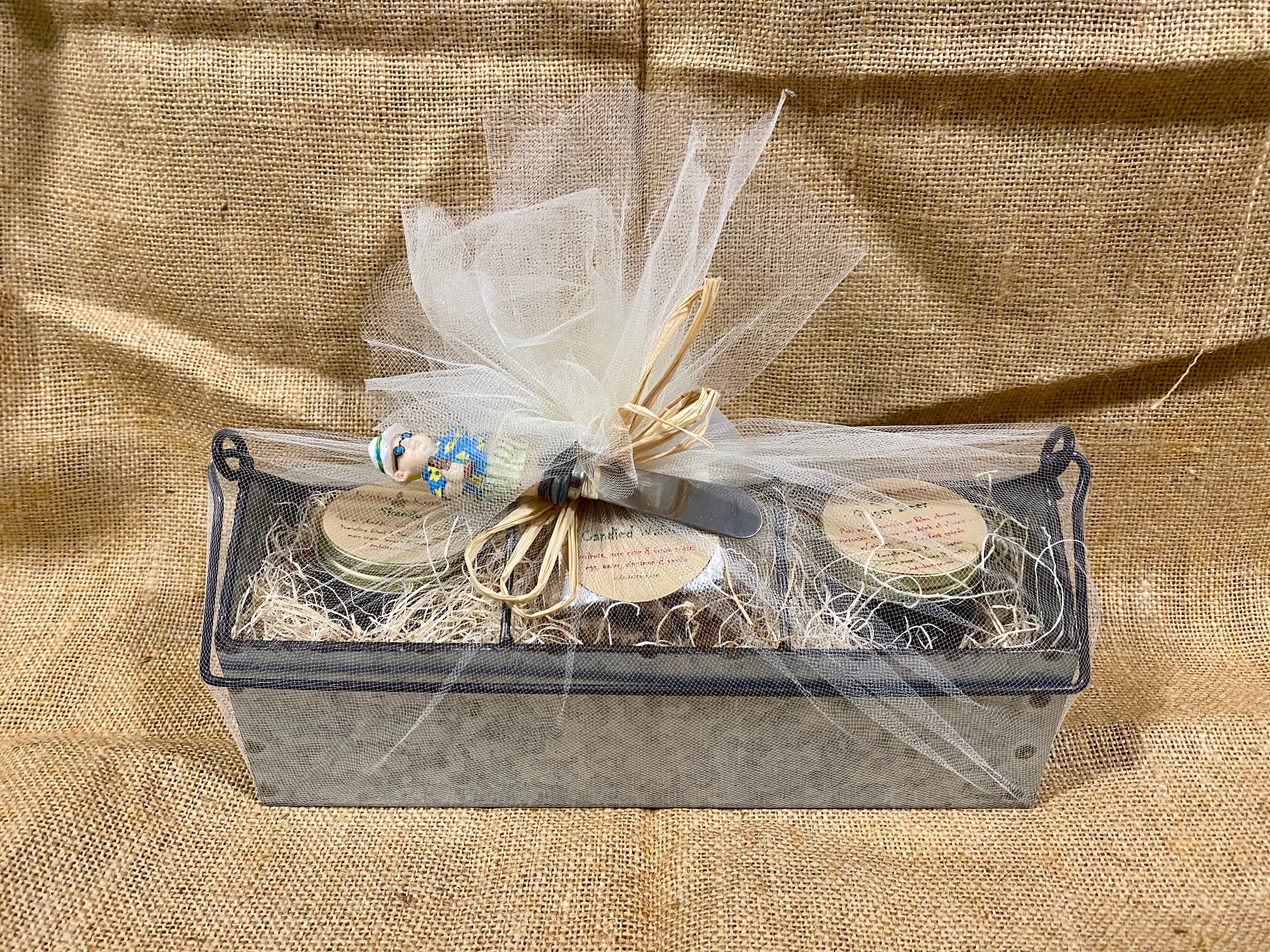 This 'Cheers' basket is a great gift for beer lovers. The metal bucket includes a bag of candied walnuts, a beer themed spreader and two 2oz jars of Kudzu Kottage beer jams Ginger Beer and Shandy.