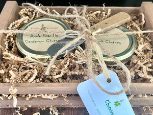 A classic chutney (from an Indian word meaning “ very spicy”) collection of five 2oz jars of Kudzu Kottage Apple Pear Fig Cardamom, Green Tonato Chutney, major Grimshaw, Spicy Indian, and Peach chutnies and a wood handled spreader.