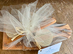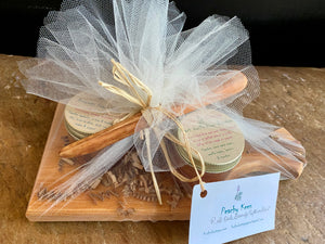This red oak wood board and handmade red oak spreader includes three 2oz jar of Kudzu Kottage Amaretto Peach Pecan, Peach Vanilla Bean Bourbon and Peach Lavender jams.