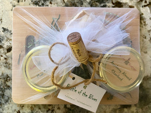 This Battle of the Blues bamboo wood board (11"x8") features two 7 oz jars of Kudzu Kottage Raspberry Almond Chambord and Plum Chutney jams, a wine cork cheese spreader and a bag of handcrafted Praline Pecans.