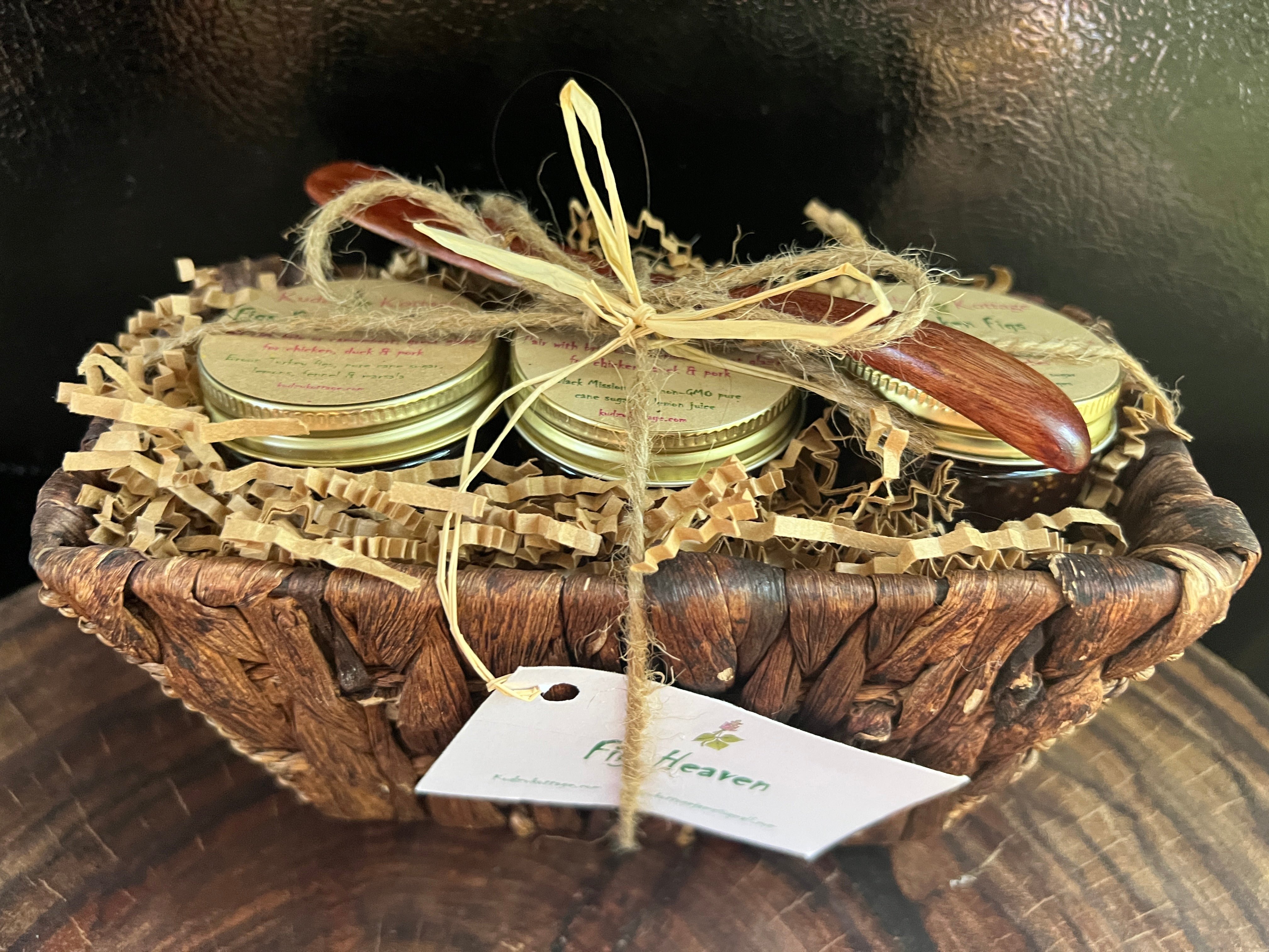 This 'Fig Heaven' gift basket features three 2 oz Kudzu Kottage jars of Just Figs, Figs Fennell Marsala and Drunken Figs jams and a wood spreader.