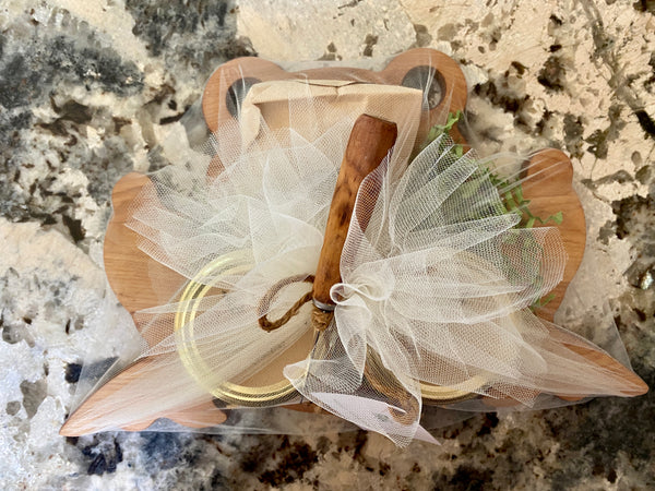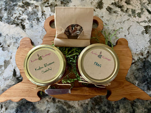 This whimsical, country, large 14" x 10” wood board shaped like a frog features two 7 oz jars of Kudzu Kottage FROG and Kudzu Blossom jams, a bag of handcrafted Praline Pecans and a matching wood handled spreader.