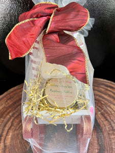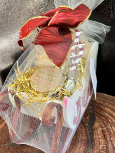 This holiday sleigh features one 2 oz jar of Kudzu Kottage White Chocolate Raspberry Kahlua jam, a white pinecone candle, a bag of handcrafted Praline Pecans and two “joy” and “Noel” holuday spreaders.