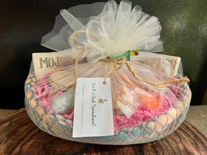 This handwoven rag/fabric bowl features four 2oz jars of Kudzu Kottage Margarita, Mojito, Lemon Drop Martini and Cosmopolitan, four stone cocktail coasters, rock Candy swivel sticks and a fun and cocktail spreader.