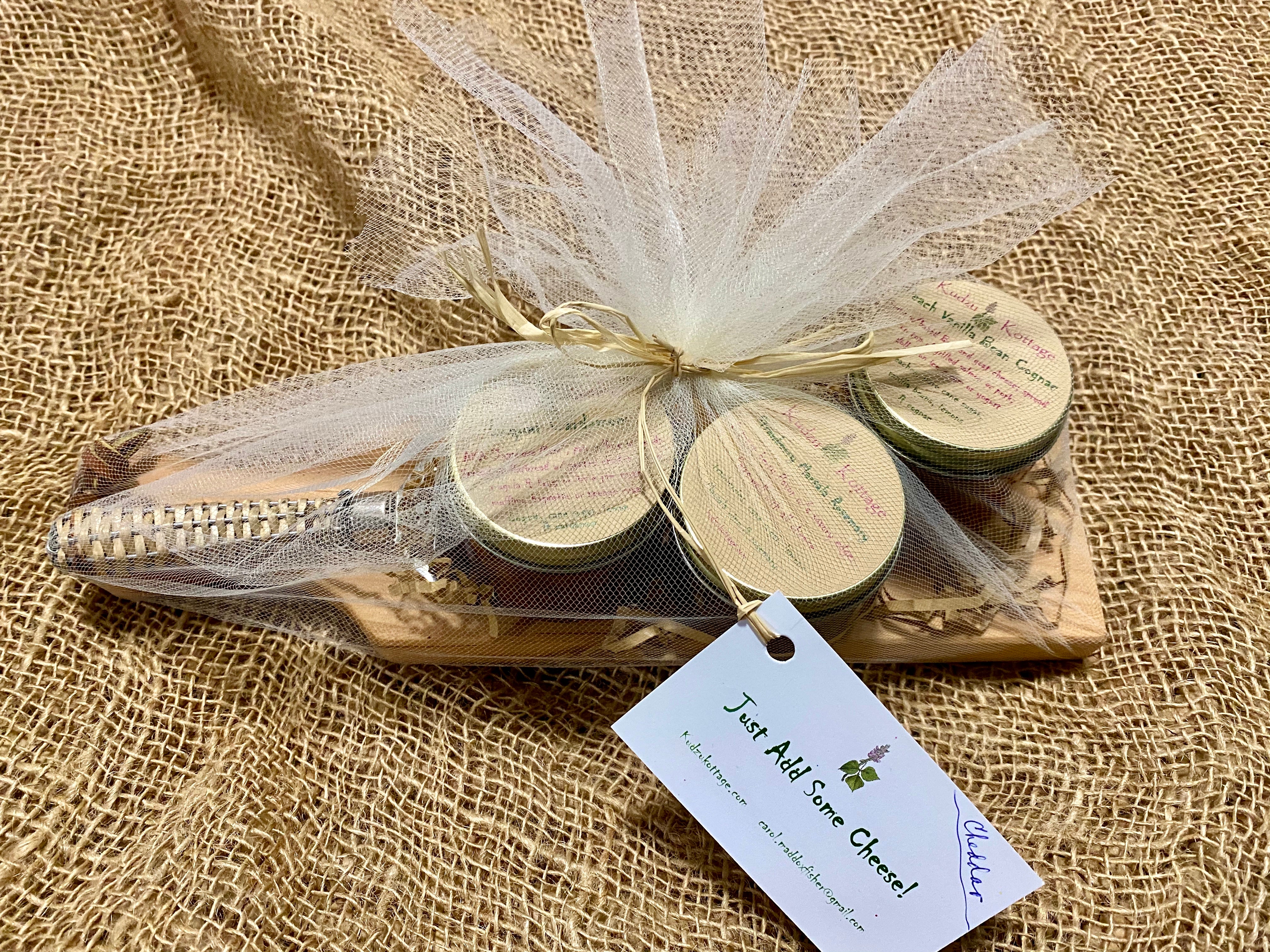 This 'Just Add Some Cheese' gift has a unique wood cheese board, a spreader and three 2oz jarsof Kudzu Kottage Strawberry Marsala Rosemary, Peach Vanilla Bean Cognac and Loquat Cardamom jams.