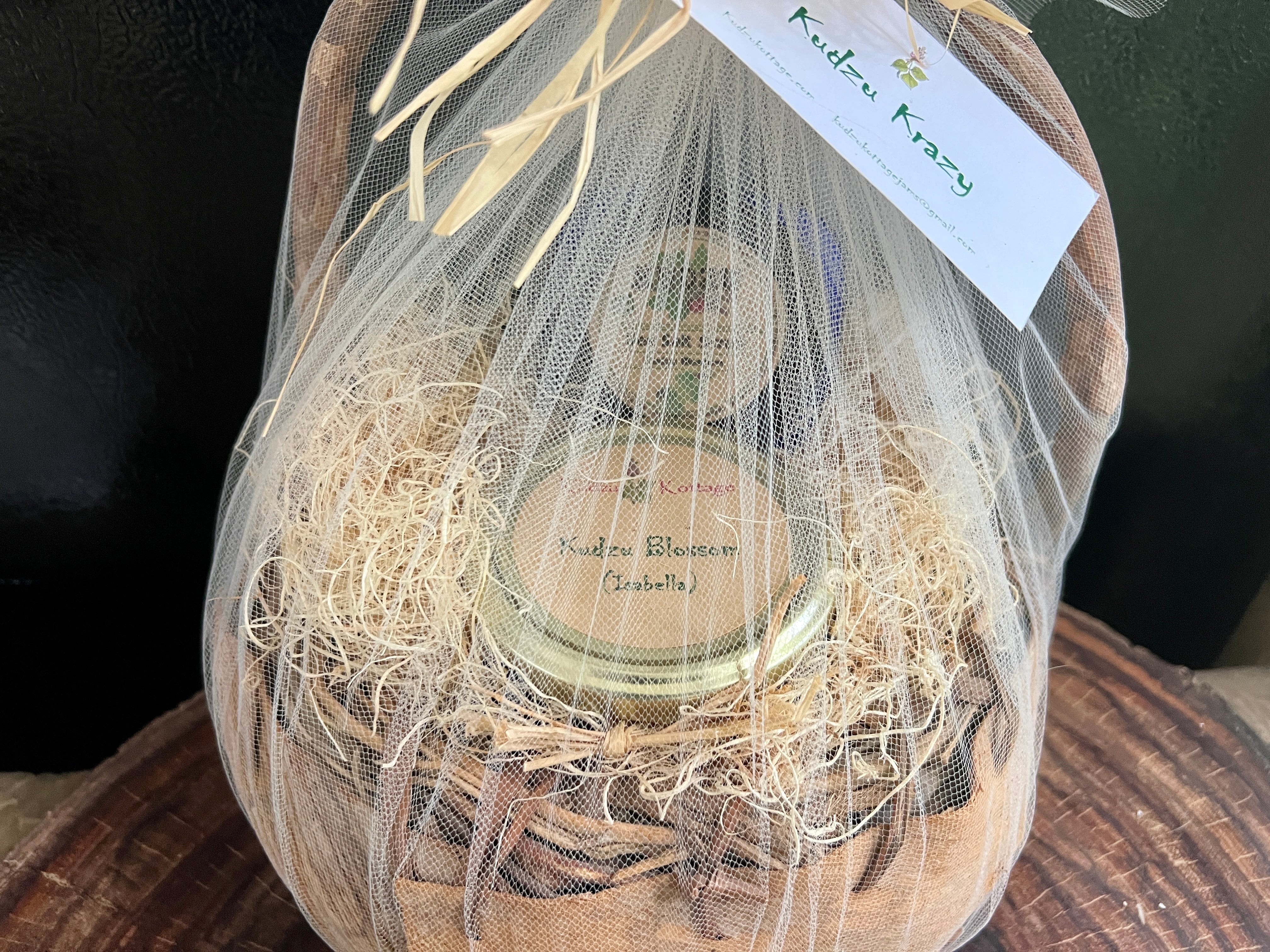 This 'Kudzu Krazy' gift basket features a jar of kudzu salt scrub and a 7oz jar of Kudzu Blossom jam.