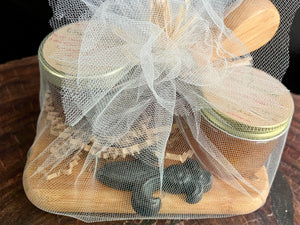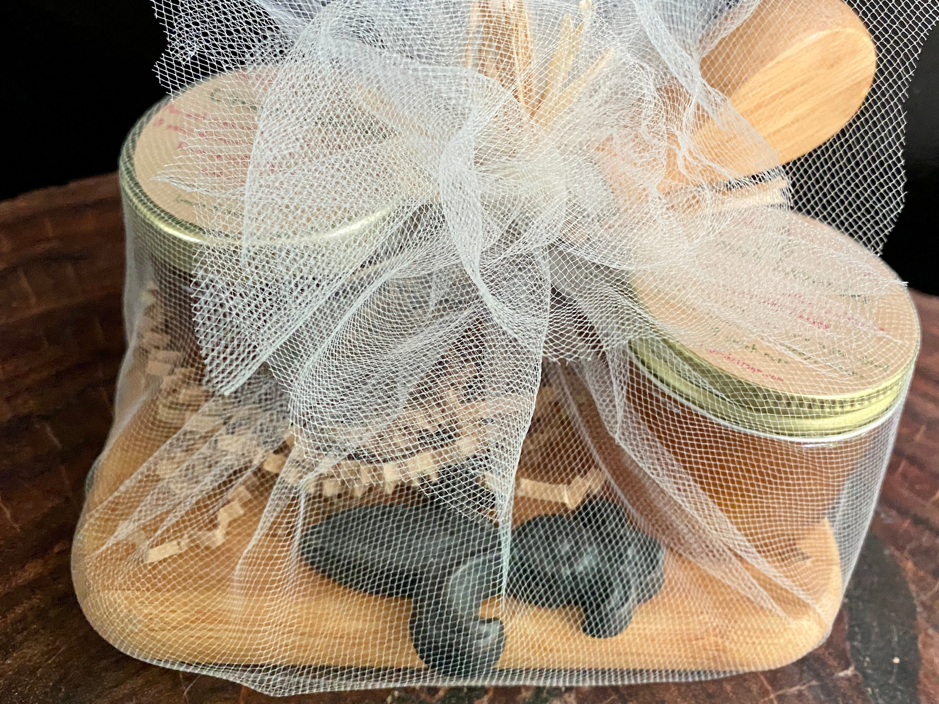 This brunch/bar bamboo board with a metal fleur de lis features three 2oz jars of Kudzu Kottage Peach Lavender, Blueberry Lavender and Citrange Lavender and a bamboo spreader.