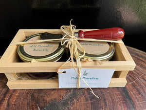 In fall in Georgia wild muscadines ripen on their vines hanging from trees. This large gift crate captures childhood memories featuring two 7 oz jars of Kudzu Kottage Wild Muscadine and Muscadine Rosemary jams and a spreader.