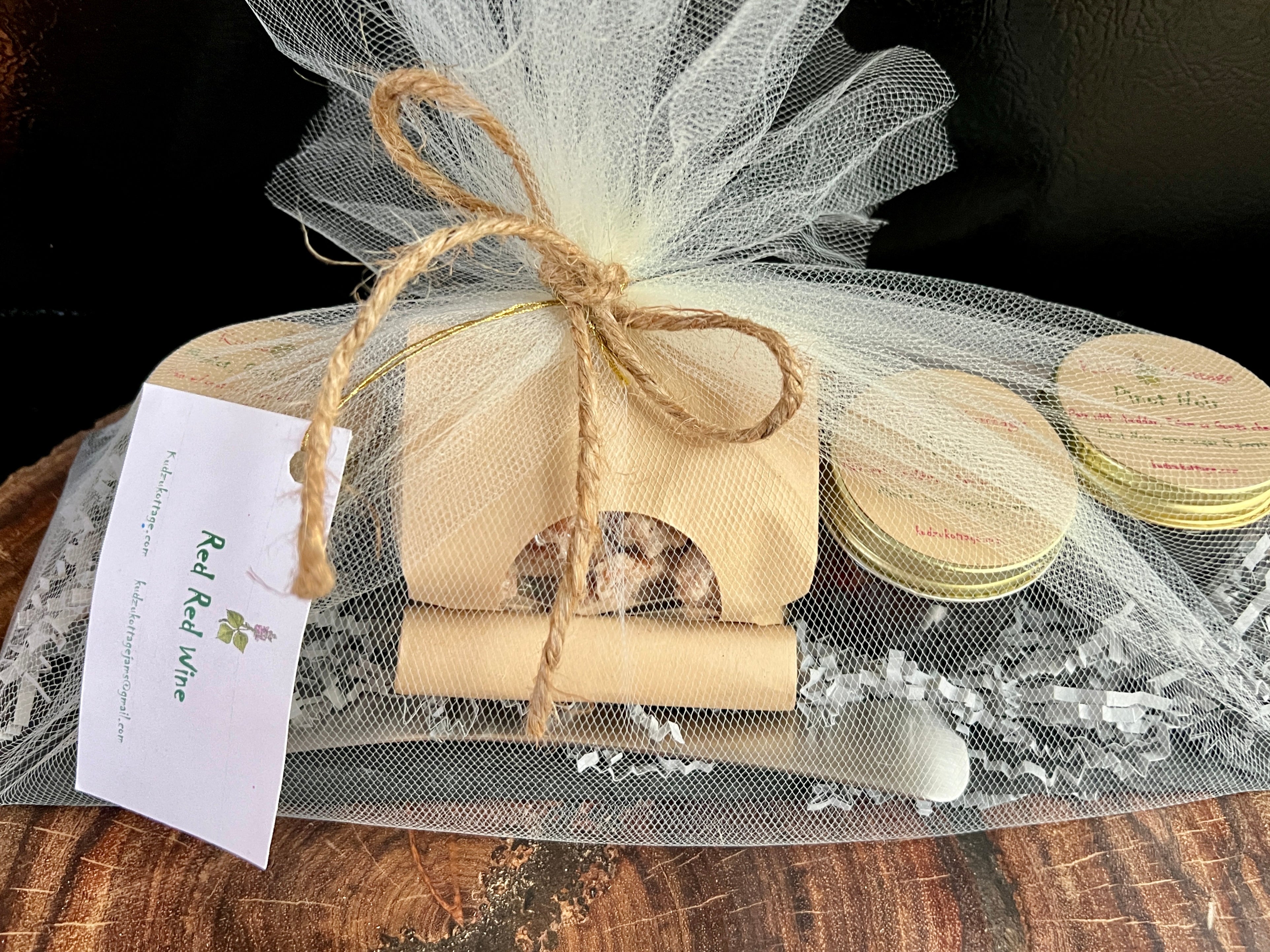 This slate charcuterie board and stainless spreader features three 2 oz jars of Kudzu Kottage Pinot Noir, Merlot Garlic Rosemary and Merlot jams and a bag of handcrafted Praline Pecans.
