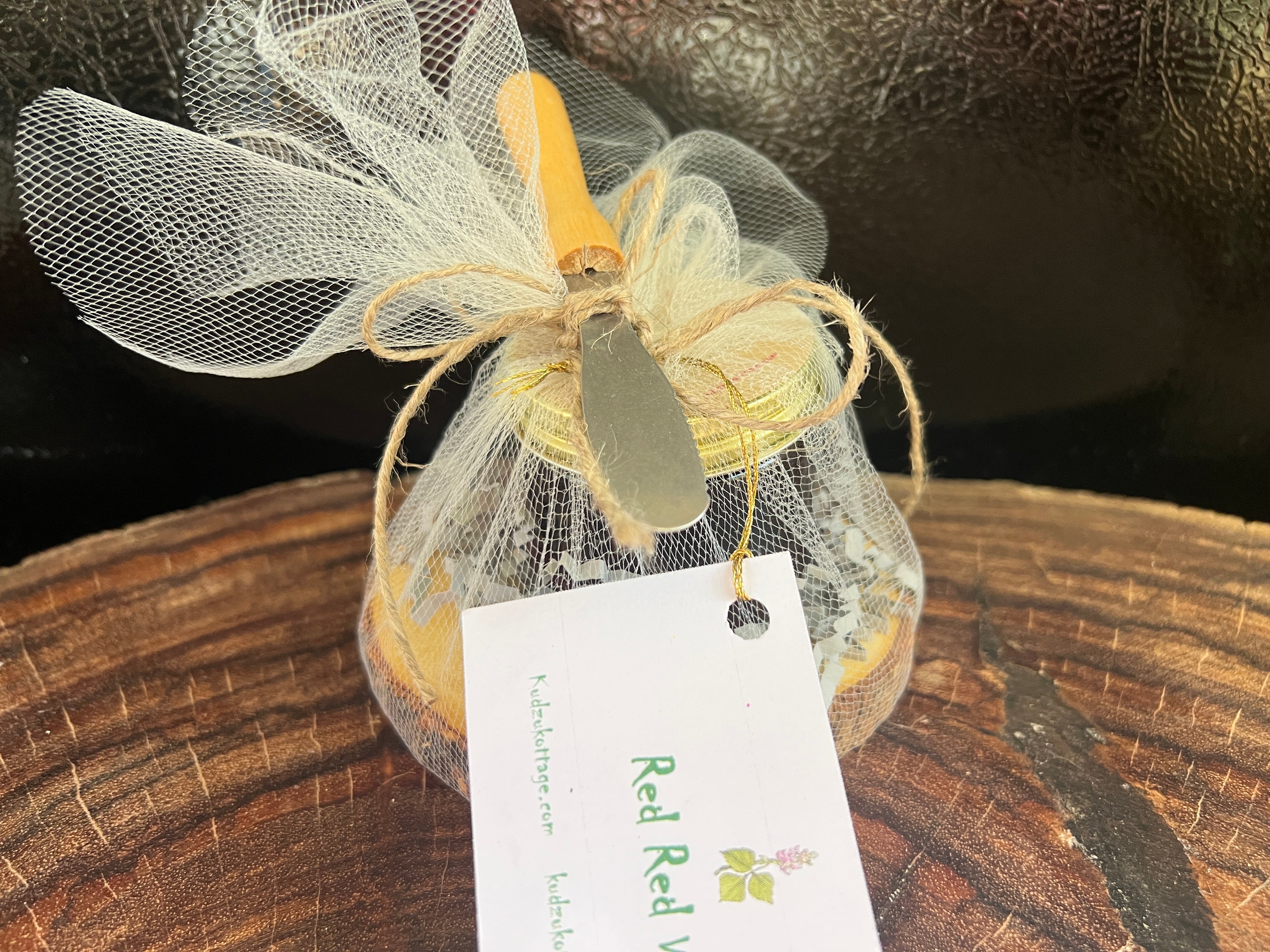 This tiny live edge wood board and tiny wood handled spreader features one 2 oz jar of Kudzu Kottage Merlot jam.