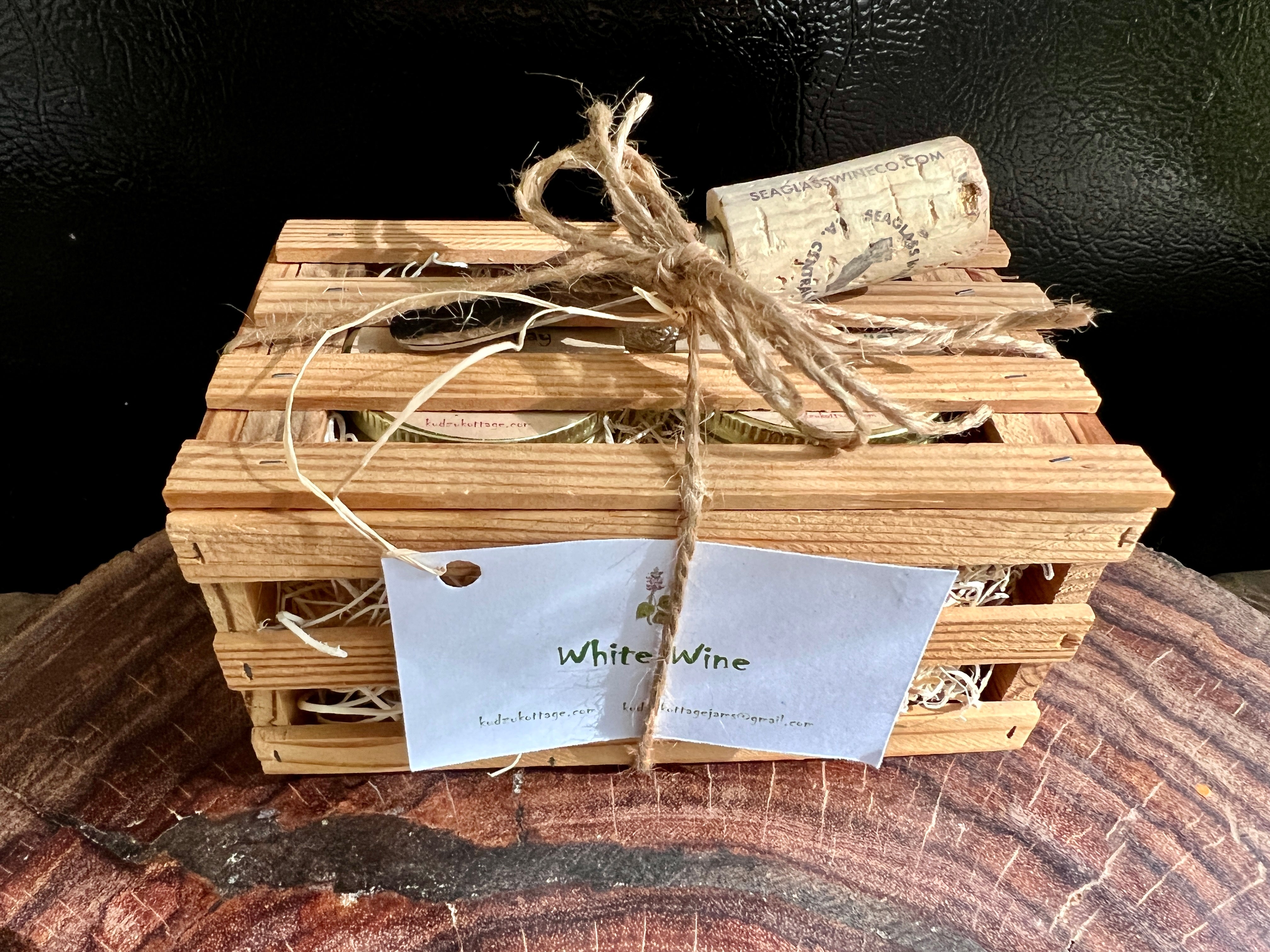 This wood gift crate features two 2 oz jars of Kudzu Kottage Chardonnay and White Zinfandel jellies and a wine cork spreader.
